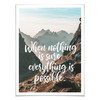 Im Hintergrund der weissen, verzierten Schrift ragen spitze Berggipfel auf, die von der Sonne beschienen werden. Dieses Bild verleiht deinem Zimmer eine angenehme Atmosphäre.