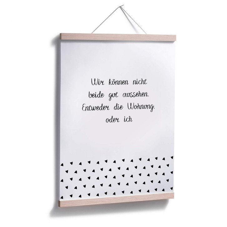 - Montagevorschläge: Tesa Tacks, Washi Tape, Posterleiste aus Eichenholz, hochwertige Posterklemmen aus Metall oder Bilderrahmen
