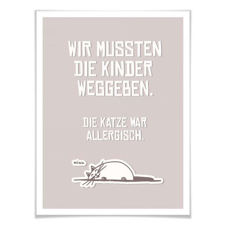 Katzenliebhaber werden dieses Poster lieben: „Wir mussten die Kinder weggeben – die Katze war allergisch“ ist ein witziger Spruch, der jeden Betrachter schnell zum Lächeln bringt. Der lustige Spruch wird von einer süssen, miauenden Katze geziert, die sich offensichtlich sehr wohl fühlt. Das Poster drückt auf humorvolle Weise deine Zuneigung zu Katzen aus und verleiht ihnen einen hohen Stellenwert. Bekenne dich mit diesem Poster als Wanddekoration als echter Katzenliebhaber und beweise gleichzeitig Sinn für Humor. Du kannst das Poster in verschiedenen Grössen bei uns bestellen. Zusätzlich ist das Motiv auch in anderen Ausführungen für Katzenliebhaber erhältlich – zum Beispiel als Leinwandbild, Wandbild oder Wanddruck. Das lustige Katzenmotiv kommt in allen Varianten gut zur Geltung und zieht auch im Kleinformat viele Blicke auf sich. Für gute Laune zu Hause: Ein witziger Spruch an der Wand macht sich in allen Wohnräumen gut.
