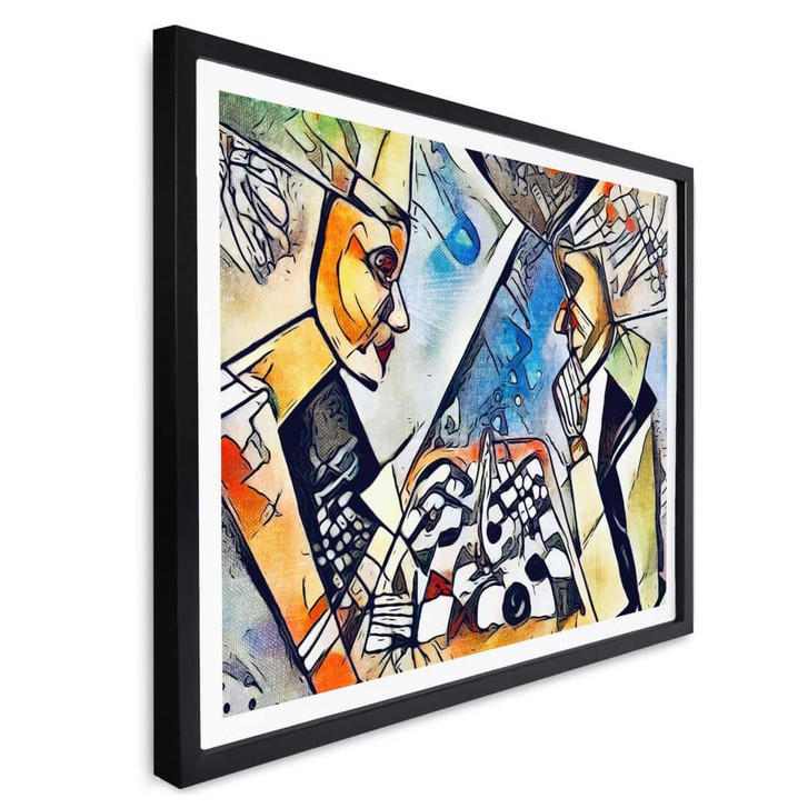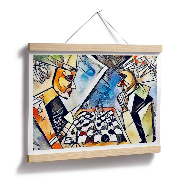 Schach – ein Spiel, das wie kein anderes mit Kunst in Verbindung gebracht wird. Es ist eine bekannte Denksportaufgabe, die Scharfsinn mit Wahnsinn verbindet. Liebhaber dieses Spiels sehen in ihm eine besondere Schönheit, die Fantasie und Kreativität weckt. Für das Gemälde „Two Chess Players“ wählte Zamart die abstrakte, figurative Kunstform und verwendete dafür Tinte und Aquarellfarben, die durch die Linien und Formen strukturiert und wohlgeordnet wirken.