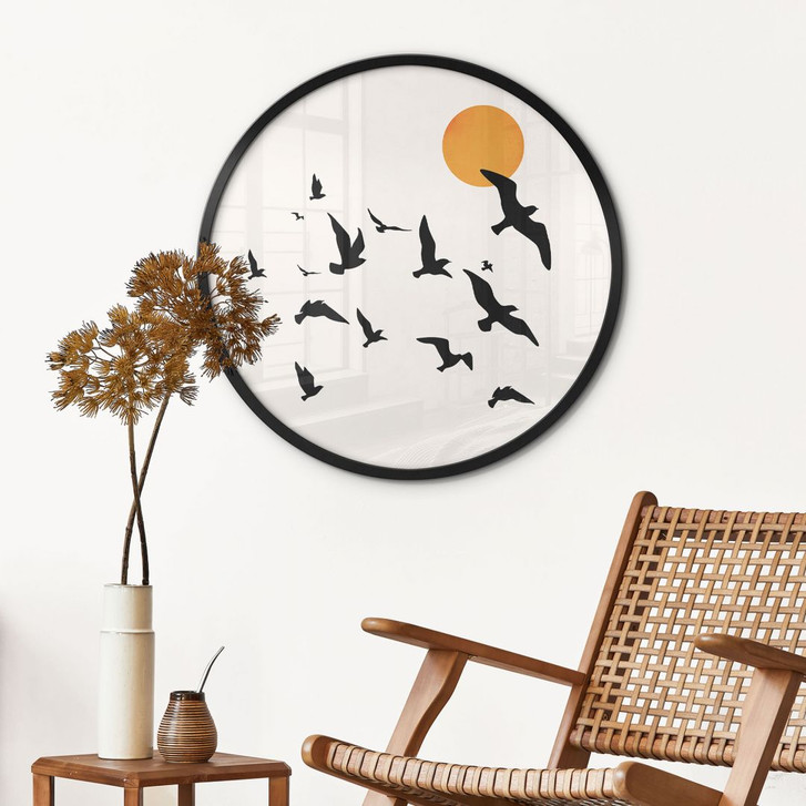 Entdecke den Stil, der zu dir passt, und gestalte ein beeindruckendes Wohnambiente! Der Kunstdruck von Kubistika zeigt Zugvögel, die der Sonne entgegenfliegen. Diese Naturidylle ruft ein Gefühl von Freiheit und Fernweh hervor. Wenn die Vögel in den Süden fliegen, ist dies ein Zeichen dafür, dass der Sommer zu Ende geht und der Herbst naht. Diese minimalistische Illustration als rundes Poster kann fast jede Wand aufpeppen.