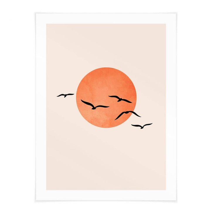 Langweilige Wände können mit der Zeit langweilig aussehen. Entdecke unsere Auswahl an bezaubernden Motiven und gestalte deine Lieblingswand mit ausdrucksstarken Kunstdrucken! Der Kubistika-Kunstdruck zeigt fünf Zugvögel, die auf ihrem Weg nach Süden an der orangefarbenen Sonne vorbeifliegen.
