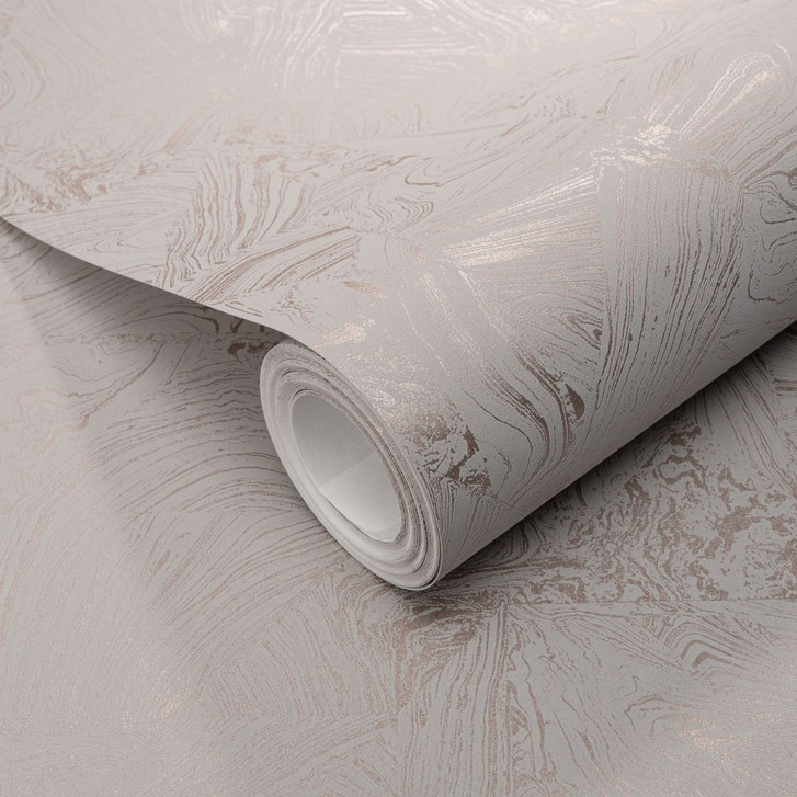 PVC-freie Vliestapete mit Marmoroptik und Metallic-Effekt in Taupe.