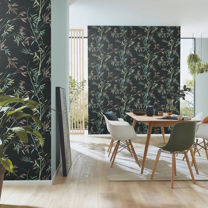 Das Tapetenmuster BAMBOORELLE besticht durch zarte Bambuskonturen mit Aquarelle-Farbeverläufen auf feiner Textilstruktur.