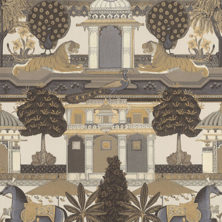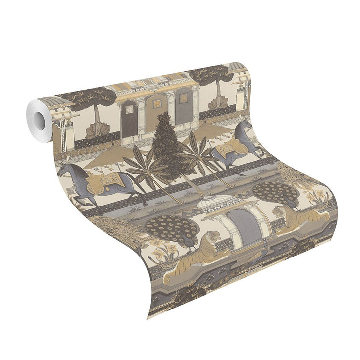 Die majestätischen Tiger, flankiert von den eleganten Pfauen, präsentieren sich im imposanten Garten des Maharadschas. Auch die Pferde schreiten stolz vor dem Palast. Was für ein beeindruckender Anblick. Neben Schwarz und Weiss ist diese Vliestapete auch in einer Vielzahl verschiedener Beige- und Grautöne erhältlich.