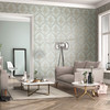 Eine Nummer grösser? Kein Problem – schliesslich kann man zeigen, was man zu Hause hat. Deshalb ist dieses barocke Tapetendesign mit einem üppigen Ornament in mattem Gold verziert, das im Heissprägeverfahren auf die Tapete aufgebracht wurde. Es hebt sich mit einem sanften Schimmer vom taubenblauen Hintergrund ab.