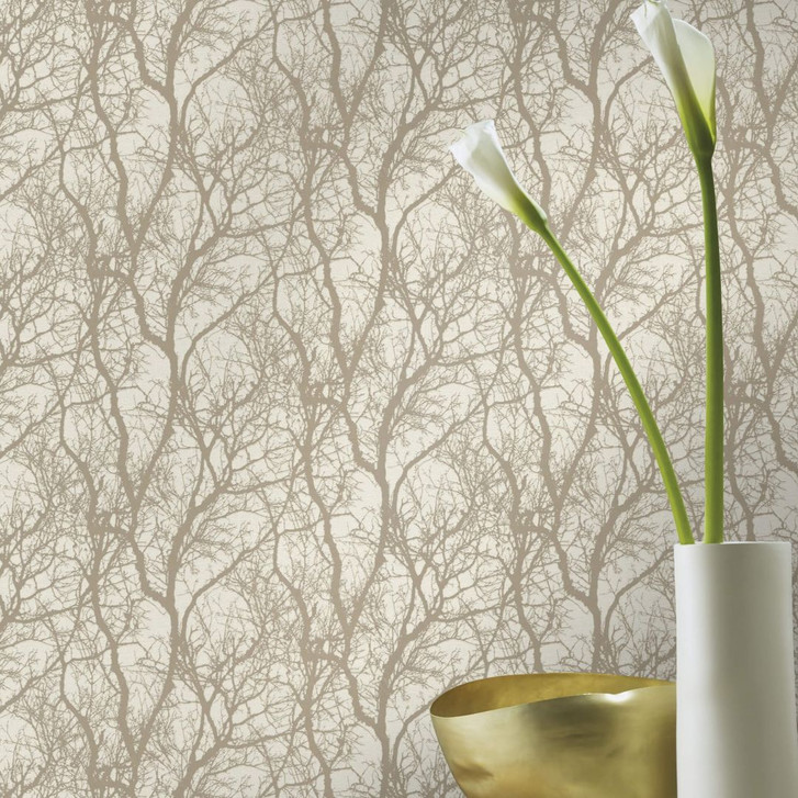 Wer sich Pflanzen ins Haus holen möchte, aber keine floralen Muster mag und etwas Elegantes sucht, ist mit dieser Strukturtapete bestens beraten. Die abstrakten Zweige, die in einer glänzenden, hellgold-bronzefarbenen Farbe vor einem weissen, matten und strukturierten Hintergrund gehalten sind, sind ein echter Hingucker. Die helle Farbgebung macht die Tapete auch zu einer guten Wahl, um eine freundliche, einladende Atmosphäre im Raum zu schaffen.