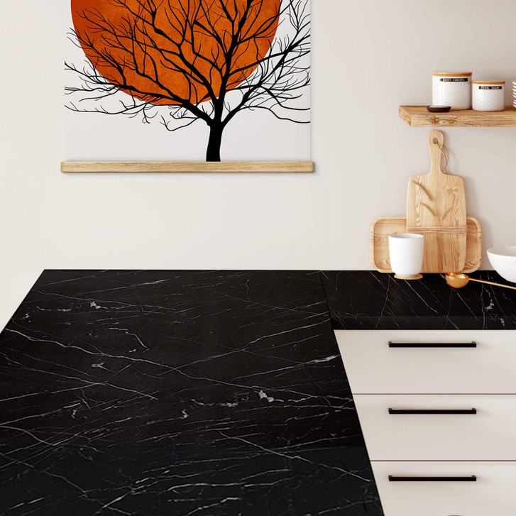 Genervt vom Anblick der alten Küchenfronten oder Schranktüren im Wohnzimmer? Mit der schwarz-weissen Folie in Marmoroptik verleihst du deinem Wunschraum einen neuen Look. Die Folie lässt sich leicht anbringen und reinigen. So kannst du den gewünschten Raum mit wenig Aufwand neu gestalten.
