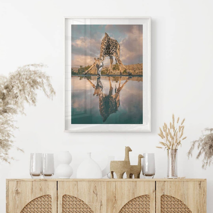 Dieses Poster von Ana Amtmann bringt die faszinierende Atmosphäre der afrikanischen Savanne in dein Zuhause. Das Motiv zeigt eine majestätische Giraffe, die sich anmutig über ein ruhiges Wasserloch beugt. Die perfekte Spiegelung im klaren Wasser unterstreicht die Harmonie der Szene und verleiht dem Bild eine beeindruckende Tiefe.
