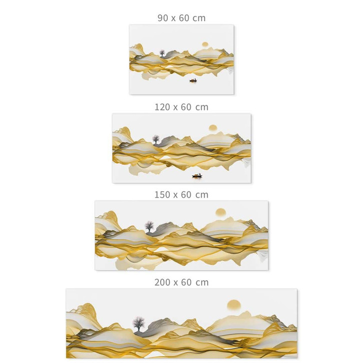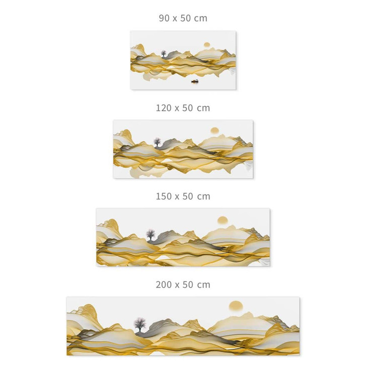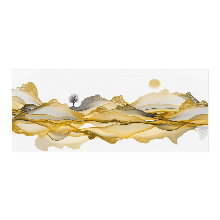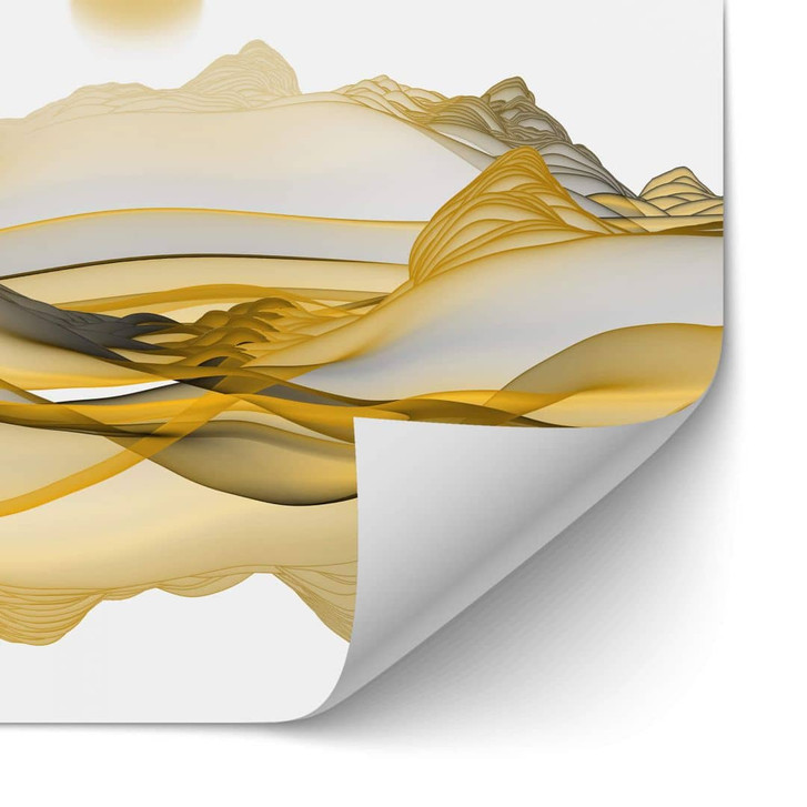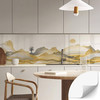 Guten Appetit! Diese Wanddekoration ist ideal für Küchen und schafft eine freundliche Atmosphäre rund um den Herd. So haben du und deine Lieben einen gemütlichen Ort zum Kochen. Die selbstklebende Küchenrückwand zeigt eine abstrakte Berglandschaft. Die Sonne lässt die Berge und Täler golden leuchten.