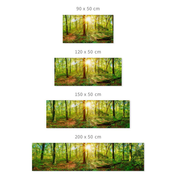 Der Wald bietet zu jeder Jahreszeit einen Ort zum Entspannen und Kraft tanken. Egal ob es regnet, schneit oder die Sonne scheint: Die Waldluft ist erfüllt vom Duft frischer Bäume und Pflanzen und es herrscht ein geheimnisvolles Lichtspiel, das immer eine entspannte Umgebung zum Durchatmen schafft. Und mit dieser Naturfotografie kannst du zu Hause ein frisches Waldflair verströmen, das eine wahre Wohltat für Körper und Seele ist. Denn die Farbe Grün macht bekanntlich glücklich und die Sonnenstrahlen sorgen für ein warmes Raumgefühl.