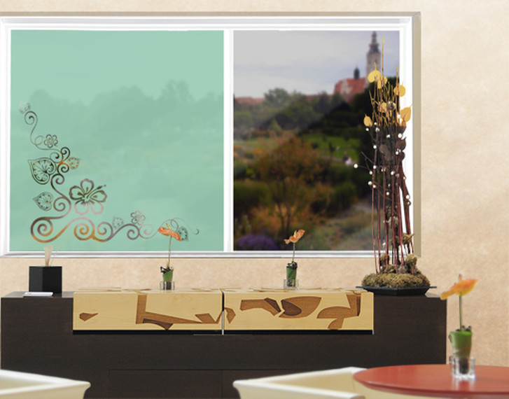 Unsere Glasdekor Tattoos werden Ihnen wie in unserer Gesamtansicht geliefert. Möchten Sie es von aussen genau so betrachten, es jedoch von innen anbringen, wählen Sie die Option "spiegelverkehrt".