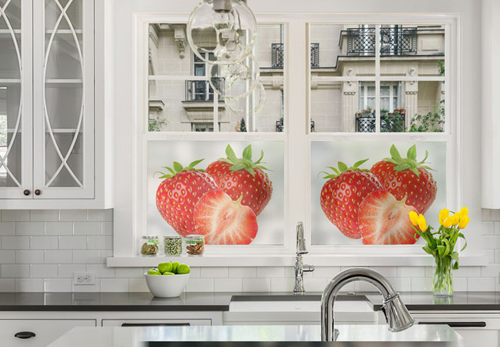 Die Sichtschutzfolie mit dem Erdbeermotiv ist in verschiedenen Grössen erhältlich.