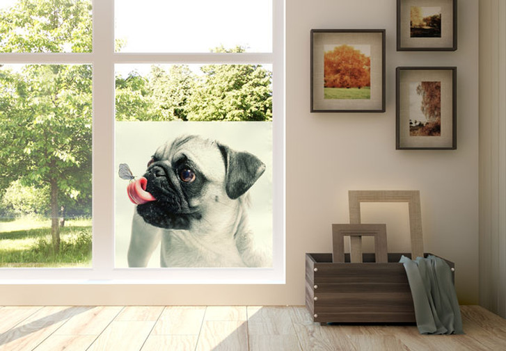 Die Sichtschutzfolie mit dem niedlichen Motiv von Hund und Schmetterling ist in verschiedenen Grössen erhältlich.