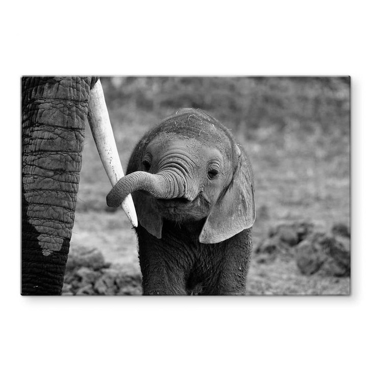 Wer kann diesem süssen Elefantenbaby widerstehen? Der Kleine hält sich ganz fest an seiner Mutter fest, damit er nicht verloren geht. Das Schwarz-Weiss-Bild ist in verschiedenen Grössen erhältlich.