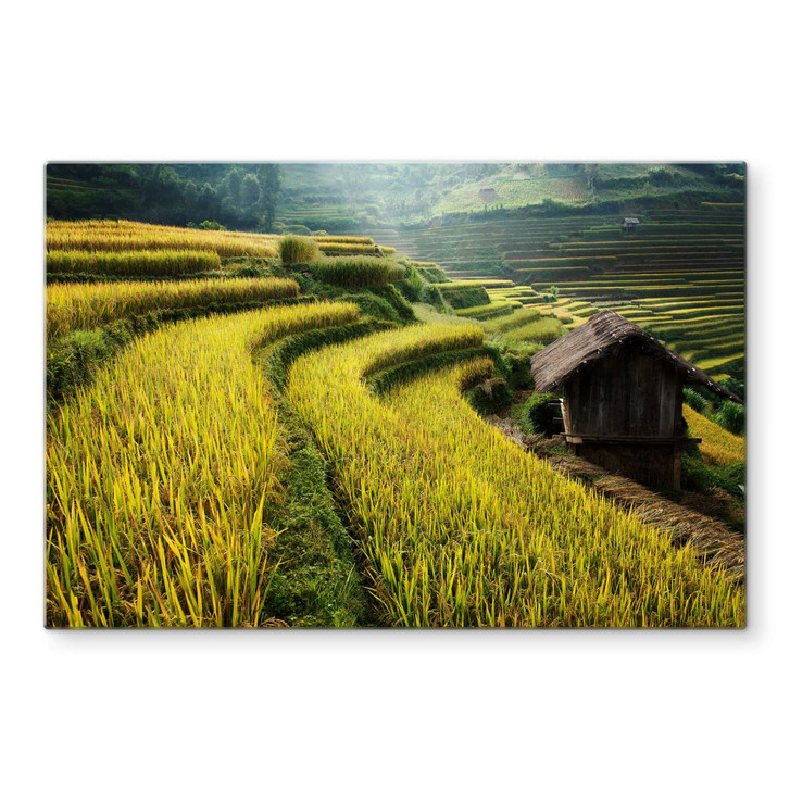 Die weitläufigen Reisfelder sind beliebte Touristenattraktionen in Vietnam. Wer schon einmal hier war, kennt den atemberaubenden Anblick der hundert Meter hohen Reisterrassen. Die leuchtend grünen Hügel bilden ein beeindruckendes Naturpanorama, das man als Wandbild in den eigenen vier Wänden geniessen kann. Von Hand gebaut und bewirtschaftet, wirken die Felder wie ein riesiges Kunstwerk, das eine wunderschöne Atmosphäre schafft. Der Reisanbau hat hier eine lange Tradition und die einzigartigen Hängeterrassen ziehen viele Touristen aus aller Welt an.