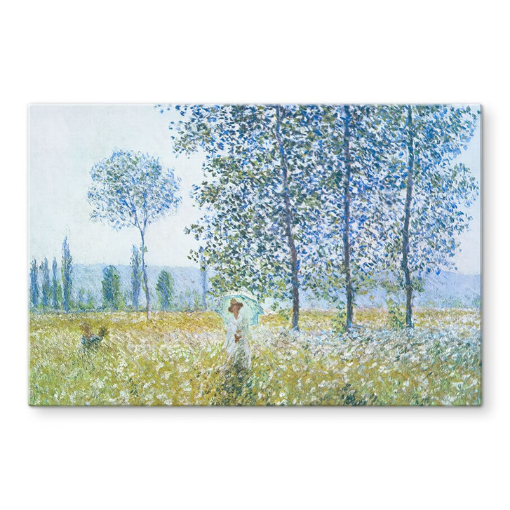 Das Motiv zeigt eine sanfte Landschaft, durchsetzt mit zarten Grün- und Blautönen, in der eine anmutige Dame mit einem Sonnenschirm durch eine lichtdurchflutete Wiese spaziert. Die luftigen Pinselstriche und das lebendige Farbenspiel verleihen dem Bild eine natürliche Leichtigkeit, während die hoch aufragenden Pappeln dem Motiv eine besondere Tiefe verleihen.