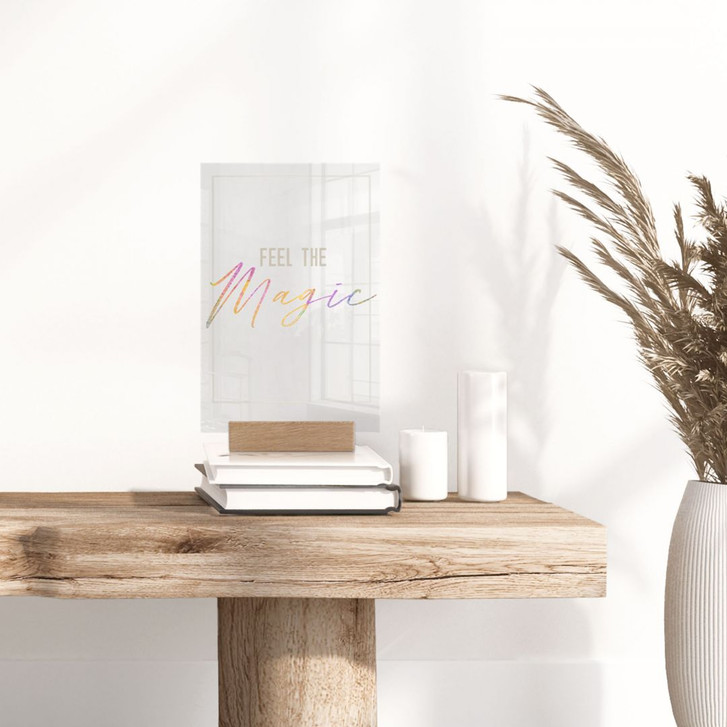 Dieser moderne Tischaufsteller verbindet klare Formen mit einer sanften und farbenfrohen Botschaft. Das transparente Acrylglas verstärkt den schwebenden Effekt der farbenfrohen Schrift, die in zarten Regenbogenfarben schimmert. Die Botschaft, die die Leichtigkeit und Magie des Alltags betont, wird zum zentralen Element und bringt einen Hauch von Inspiration und Positivität an deinen Arbeitsplatz oder in deinen Wohnbereich.