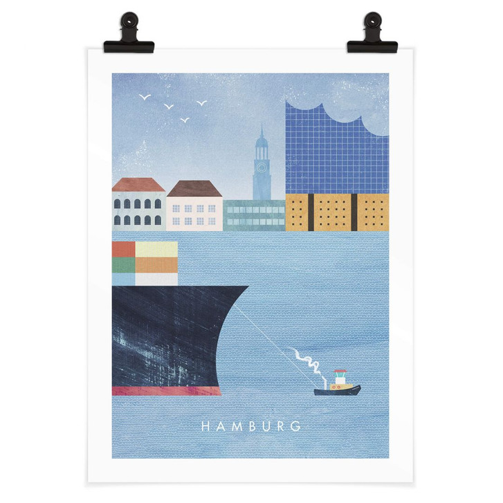 Lass dich von unserer grossen Auswahl an Stadtansichten inspirieren und finde das perfekte Bild für deine Einrichtung! Die Hafenstadt Hamburg ist berühmt für ihre schönen Flüsse Alster und Elbe. Traditionelle Kaufhäuser und Kulturdenkmäler prägen das Stadtbild. Ein typisches Wahrzeichen Hamburgs ist die Speicherstadt, auch Lagerstadt genannt. Die auf Holzpfählen gebauten Lagerhäuser sind über zahlreiche Kanäle und Brücken zugänglich. Mit der Illustration von Henry Rivers als Poster holst du dir eine beliebte norddeutsche Stadt nach Hause, die durch ihr auffälliges Design besticht. Der britische Illustrator Henry Rivers nimmt dich mit auf eine Reise zu einigen der beliebtesten Reiseziele der Welt. Seine Bilder bestechen durch ihre kühlen Farben im Retro-Design und minimalistische Kunstform. Sie erinnern an Reisplakate aus früheren Zeiten und wecken Fernweh. Wer das Reisen liebt, wird die Kollektion von Travel Poster Co. lieben!