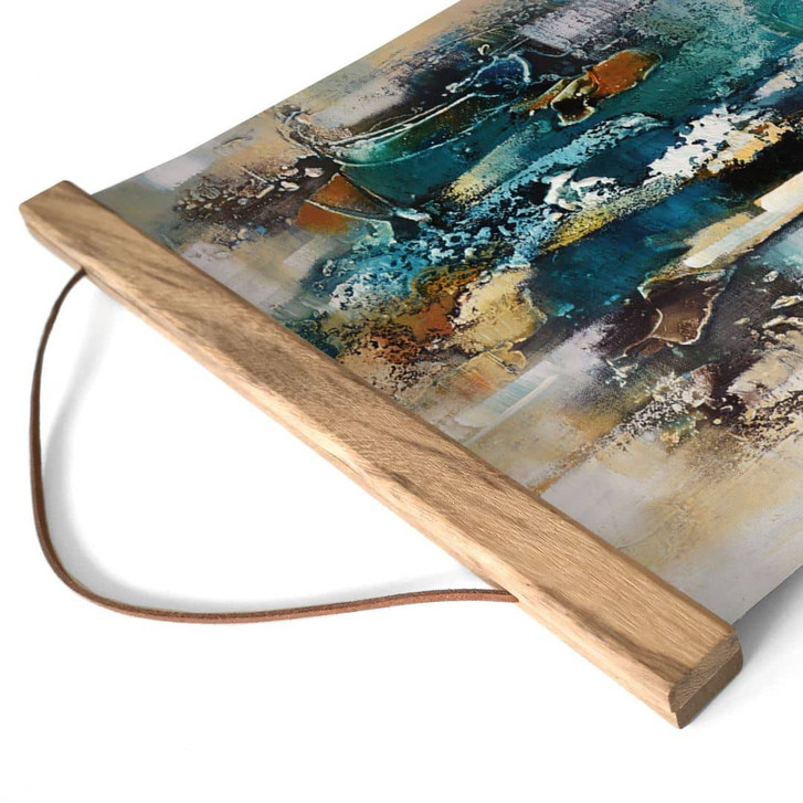 Dank der natürlichen Holzleisten wirkt das Bild sowohl modern als auch warm und fügt sich mühelos in verschiedene Einrichtungsstile ein – von minimalistischen über klassische bis hin zu Boho-inspirierten Räumen. Die optionale Posterleiste unterstreicht die Leichtigkeit des Stoffbildes und erleichtert die Präsentation.