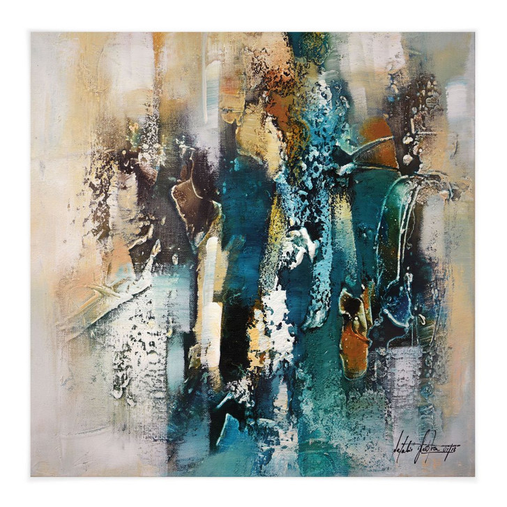 Der Stoffdruck von Natalie Fedrau verbindet Eleganz und moderne Ästhetik perfekt. Die lebendige Kombination aus tiefen Türkistönen, warmen Beigetönen und dynamischen Kontrasten schafft ein fesselndes Kunstwerk, das jeden Raum in ein kleines Atelier verwandelt.