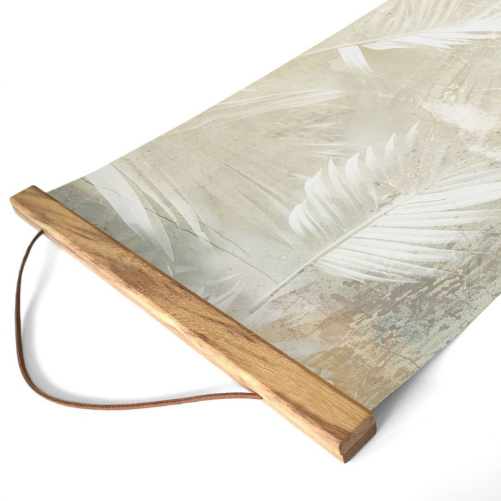 Dieses Panorama-Stoffbild, gestaltet vom talentierten Künstler Rafal Kulik, bringt die Schönheit der tropischen Natur in Ihre Räume. Die zarten weissen Palmblätter, die sich sanft von einem Hintergrund aus warmen Beige-, Creme- und Grüntönen abheben, verleihen dem Motiv eine entspannte und harmonische Wirkung. Die vertikale Ausrichtung des Bildes betont die Höhe des Raumes und schafft eine elegante und luftige Atmosphäre.