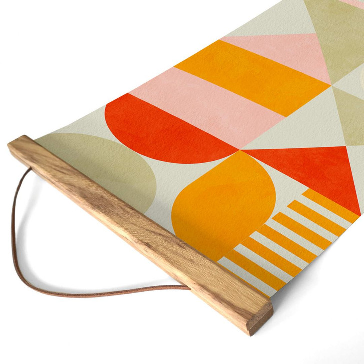 Hol dir ein farbenfrohes Stoffbild ins Haus und sorge für einen schönen Farbtupfer an deiner Wand! Der Kunstdruck von Ana Rut Bre zeigt abstrakte moderne Kunst im Bauhaus-Stil. Die leuchtenden Dreiecke und Halbkreise in Pastellfarben, darunter Rosa-, Orange- und Salbeigrüntöne, bilden eine visuell auffällige Komposition, die die Aufmerksamkeit des Betrachters sofort auf sich zieht. Die grafischen Formen verleihen dem Kunstwerk Tiefe und Dimension.
