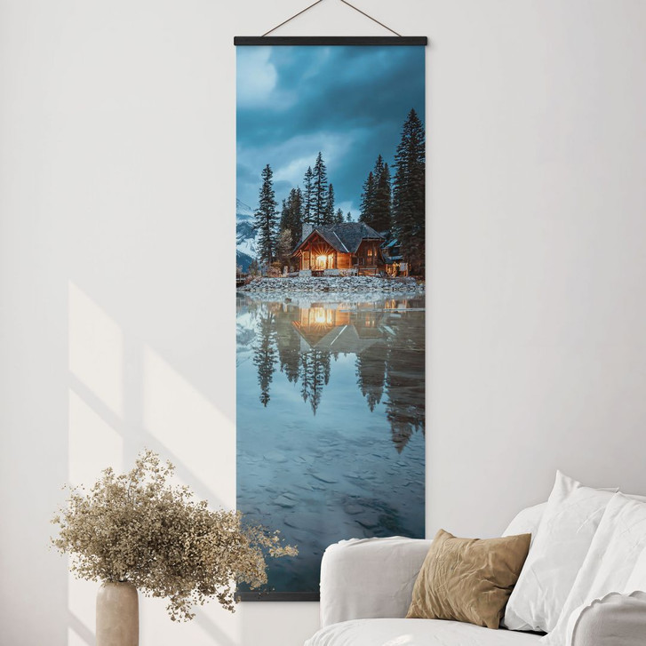 Dieses Panorama-Stoffbild mit optionaler Posterleiste zeigt die bezaubernde Landschaft des Emerald Lake im Yoho-Nationalpark in Kanada. Im Mittelpunkt steht eine warme, einladende Hütte am Seeufer, deren Licht sanft in die winterliche Landschaft strahlt. Die Spiegelungen im klaren Wasser verstärken das Gefühl von Stille und Verbundenheit mit der Natur.