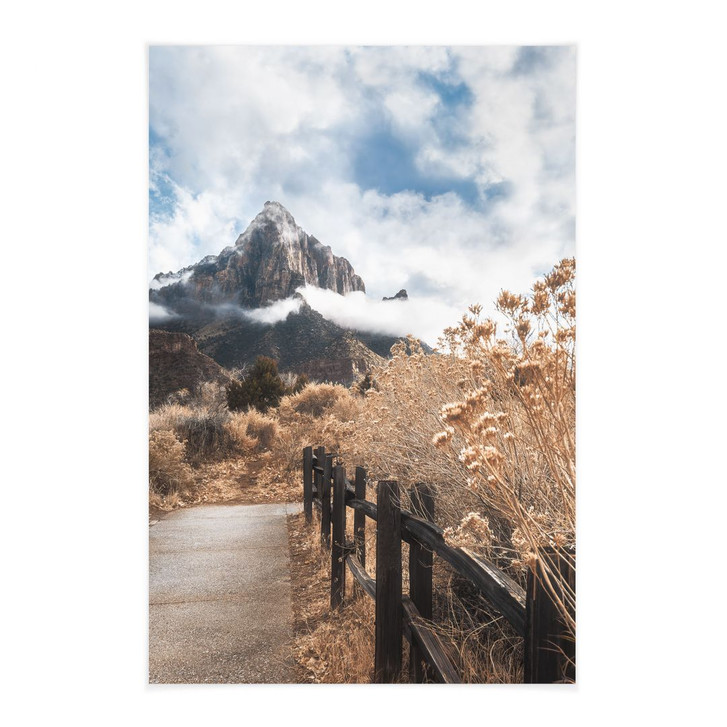 Dieses beeindruckende Stoffbild bringt die majestätische Schönheit des Zion-Nationalparks in Utah direkt zu dir nach Hause. Das Motiv zeigt einen idyllischen Pfad, der sich durch die goldene Herbstlandschaft des Parks schlängelt und zu einem imposanten Berggipfel führt, der in dramatische Wolken gehüllt ist. Die natürliche Farbpalette aus warmen Erdtönen und dem strahlenden Blau des Himmels schafft eine Atmosphäre, die sowohl beruhigend als auch inspirierend ist und Ihre Räume in eine Oase der Ruhe und Nähe zur Natur verwandelt.