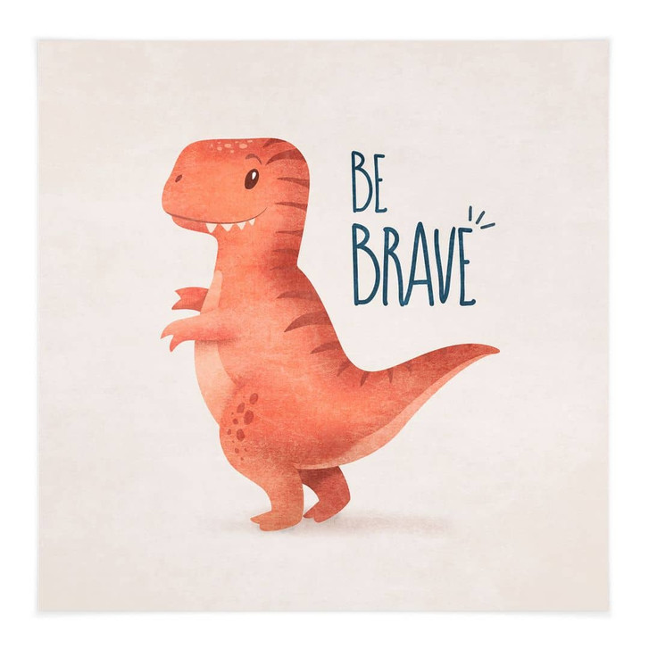 Nicht nur zum Schlafen: Kinder- und Jugendzimmer haben viele Funktionen. Schliesslich werden sie zum Spielen, Lernen und Erwachsenwerden genutzt. Deshalb ist unsere Dekoration auf diese Bedürfnisse zugeschnitten. Das Wandbild mit dem Motiv der Künstlerin Emel Tunaboylu zeigt einen kleinen T-Rex. Daneben steht der Schriftzug „Be Brave“. Damit wird der kleine rote Tyrannosaurus zum neuen Freund im Baby- oder Kinderzimmer.