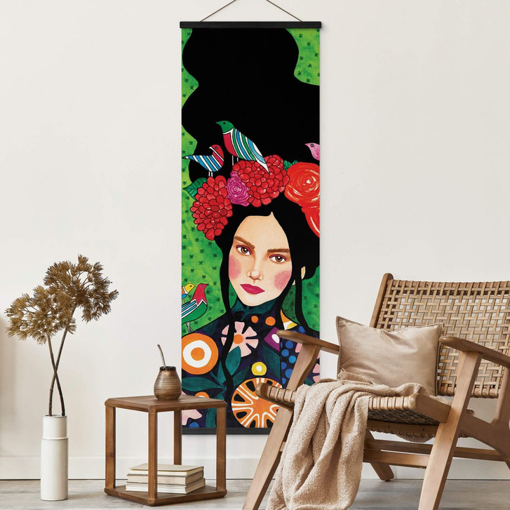 Setze mit diesem Kunstwerk künstlerische Akzente an deiner Wand! Wahre Schönheit kommt von innen. Und die innere Stärke dieser Frau strahlt nach aussen. Die Blumen und Vögel in Kombination mit den leuchtenden Farben unterstreichen die positive Ausstrahlung des Bildes. Hülyas Kunstwerk ist inspirierend und wird ein echter Hingucker an der Wand sein. Dieses Textilbanner eignet sich ideal zur Dekoration des Wohn- und Schlafzimmers. Das Polyestermaterial mit Satin-Finish schafft sofort einen eleganten Blickfang im Raum. Passend dazu bieten wir Holzleisten in verschiedenen Farben an. Mit der Leiste und dem integrierten Magnetverschluss lässt sich das farbenfrohe Motiv schnell und einfach an der Wand befestigen. Das Motiv kann beliebig oft gewechselt werden. Mit diesem Stoffbild setzt du ein echtes Highlight in deinen Räumen!