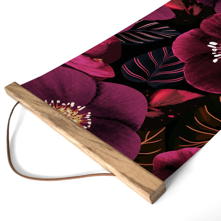 Dieses elegante Stoffbild von Anis Illustration bringt florale Schönheit mit moderner Leichtigkeit in dein Zuhause. Die tiefen Violetttöne der üppigen Blüten entfalten sich vor dem dunklen Hintergrund mit faszinierender Strahlkraft, während goldene und rötliche Blätter kunstvolle Akzente setzen. Die vertikale Komposition verleiht diesem Design eine besonders elegante und ausdrucksstarke Wirkung.