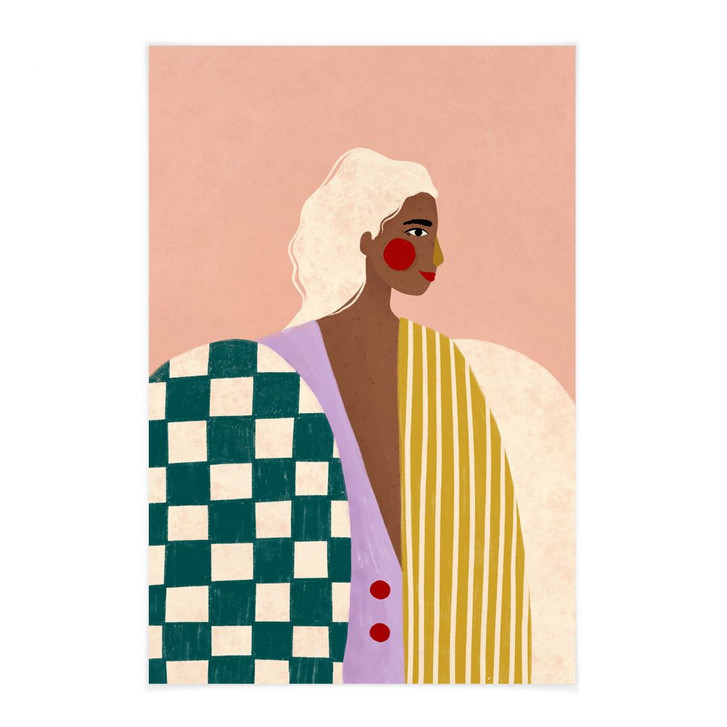 Dieses einzigartige Motiv zeigt eine stilisierte Frau, die von geometrischen Mustern und lebendigen Farbakzenten umgeben ist. Das smaragdgrüne Schachbrettmuster, die warmen senfgelben Streifen und der zartrosa Hintergrund harmonieren perfekt miteinander und verleihen dem Bild einen kraftvollen und zugleich eleganten Look. Dezente Details wie die roten Wangen und minimalistische Linien runden die Komposition ab und betonen den modernen Charakter des Motivs.