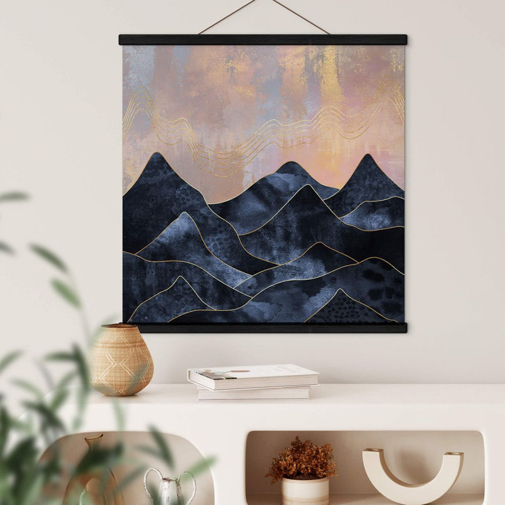 Zaubere mit dieser Wanddekoration ein trendiges Wohnerlebnis und verleihe deinen Wänden den perfekten Look. Der Kunstdruck von Elisabeth Fredriksson ist ein farbenfrohes Highlight an der Wand. Er zeigt eine in Blau marmorierte Bergkette. Im Hintergrund werden weitere Berge in goldenen Linien angedeutet.