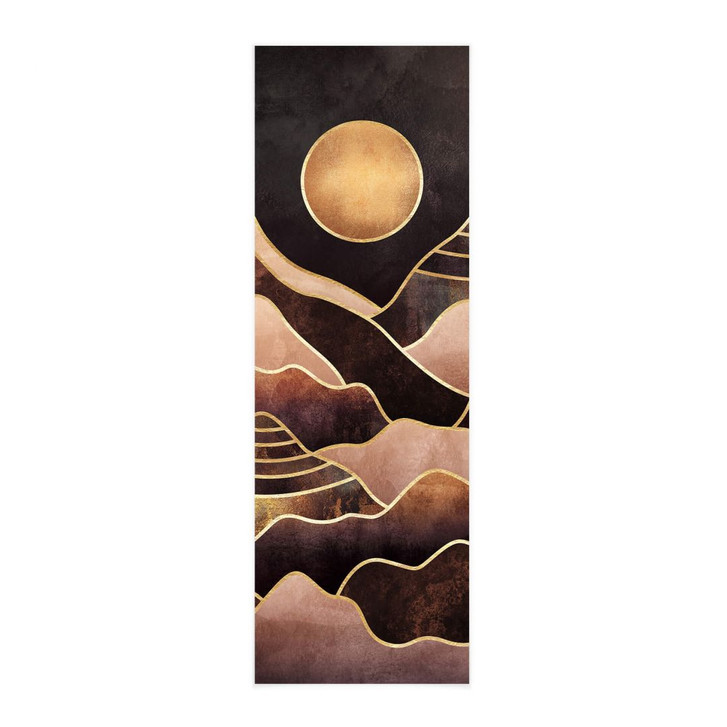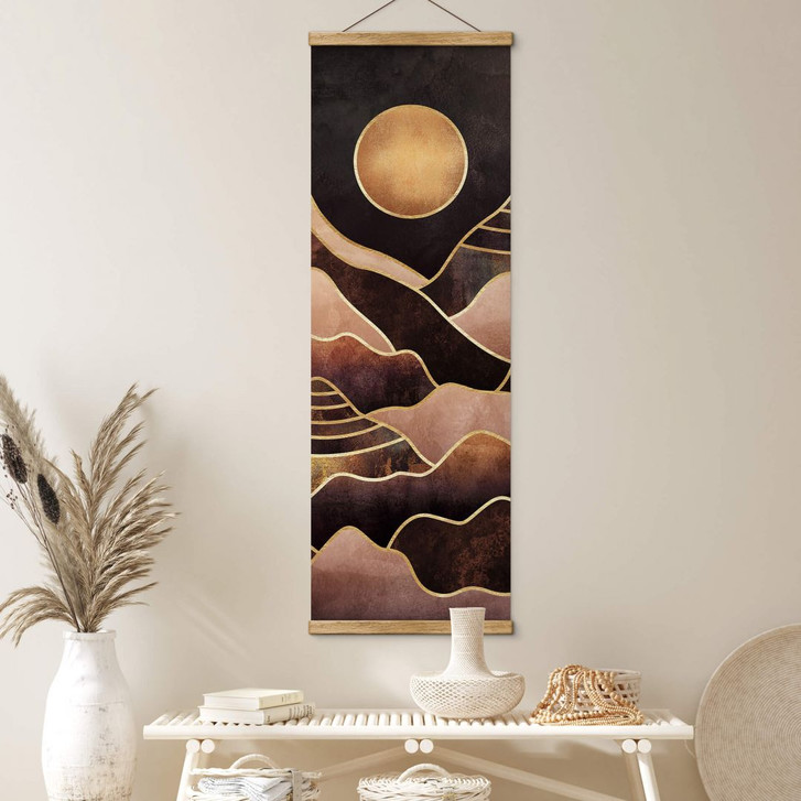 Elisabeth Fredrikssons Illustration ist ein moderner Hingucker an der Wand. Die warmen Farben Gold und Braun des Sonnenuntergangs dominieren hier im abstrakten Motiv. Die golden schimmernde Sonne steht im Mittelpunkt, umgeben von wellenförmigen Bergen, die dem Bild eine dekorative Note verleihen.