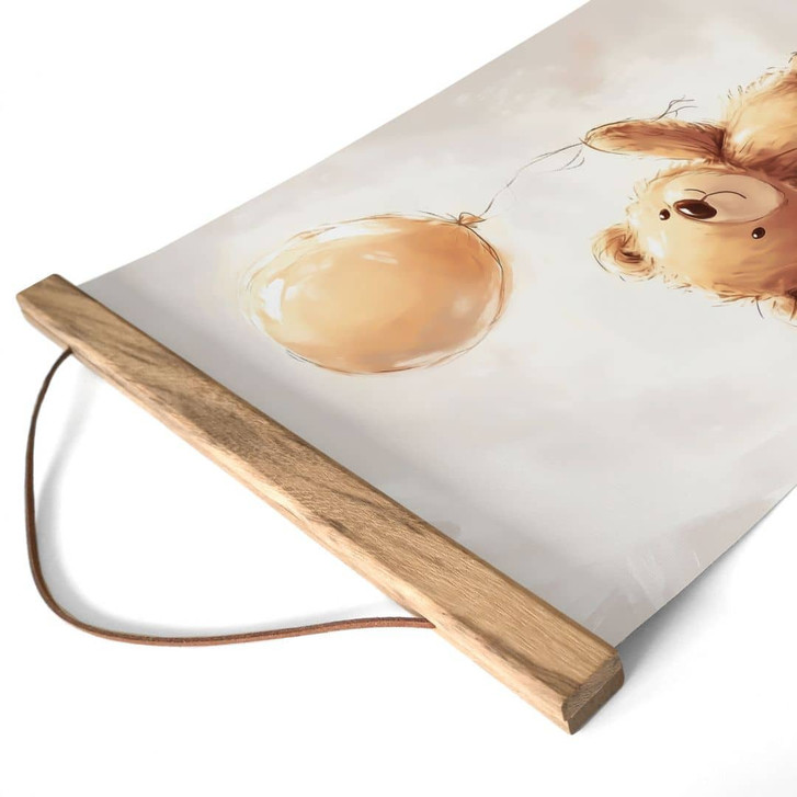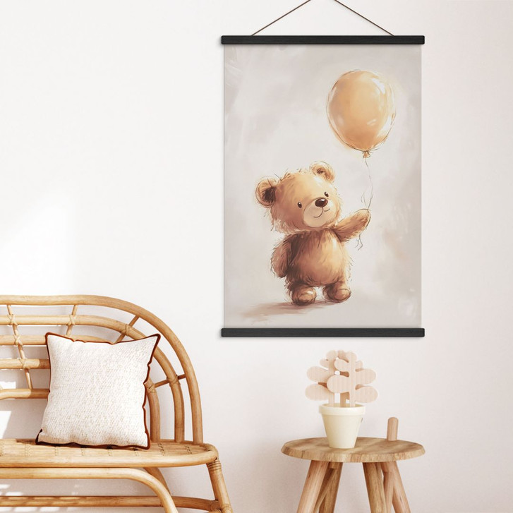 Mit seinem freundlichen Lächeln und dem sanft schwebenden Luftballon lädt dieser kleine Teddybär zum Träumen ein. Die warmen Farbtöne und die weichen, handgezeichneten Details verleihen dem Motiv eine beruhigende und verspielte Wirkung – ideal für Kinderzimmer, Spielbereiche oder als sanfter Blickfang in Wohnzimmern.