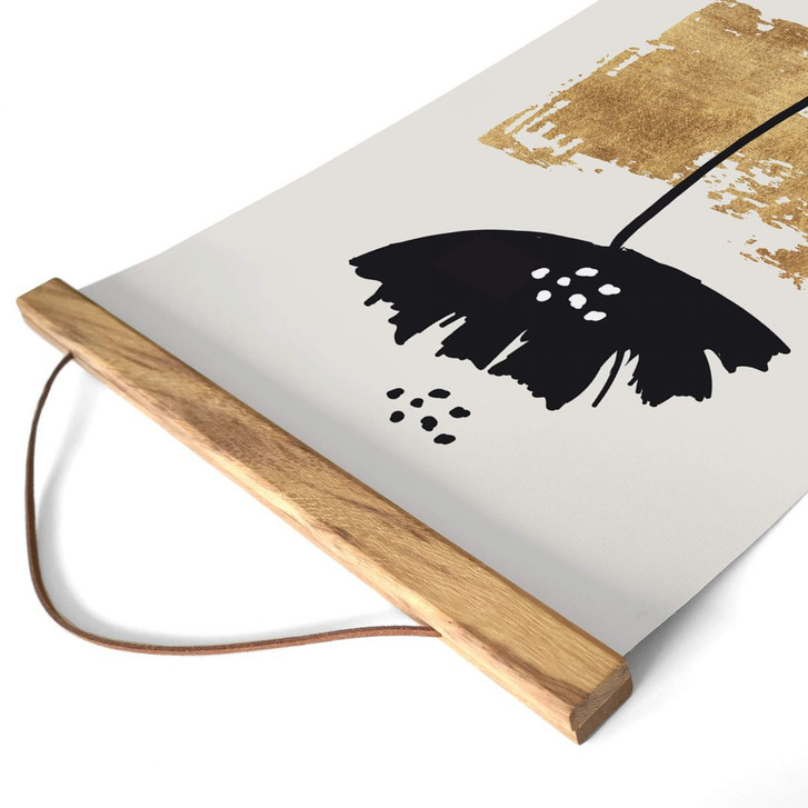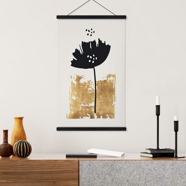 Bei der Einrichtung spielt die Wanddekoration eine wichtige Rolle. Sie trägt dazu bei, eine entspannende Wohnatmosphäre zu schaffen. Schmücke leere Wände mit dem harmonischen Wandmotiv! Botanische Motive gehören schon lange zur modernen Wohnkultur. Sie verbessern nicht nur das Aussehen, sondern schaffen auch eine angenehme Raumatmosphäre. Das abstrakte Blumenmotiv von Kubistika verbreitet Gemütlichkeit und das Hochformat passt wunderbar dazu. Dank des minimalistischen Designs in Schwarz- und Goldtönen ist das Textilbanner nahezu überall einsetzbar und kann auch mit verschiedenen Motiven nach Belieben kombiniert werden. Das Stillleben im Boho-Stil macht jede Wand zum trendigen Hingucker.