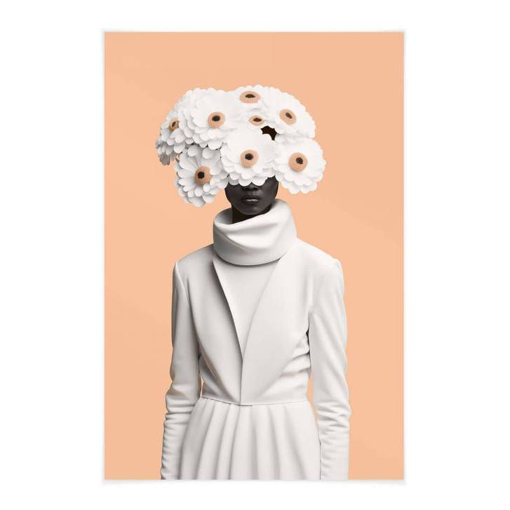 Dein Zuhause verdient eine aussergewöhnliche Dekoration, die deinem Geschmack entspricht und dich dazu einlädt, dich immer wieder wohl zu fühlen. Der Treechild-Kunstdruck ist ein echter Hingucker an der Wand! Eine Frau in schicker weisser Kleidung trägt einen auffälligen Blumenkopfschmuck. Das Weiss kontrastiert wunderschön mit der pfirsichfarbenen Hintergrundfarbe.