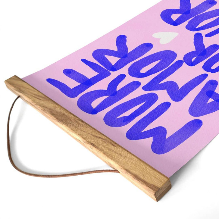 Baroo Bloom ist eine leidenschaftliche Grafikdesignerin und Illustratorin, die Blumen und Farben liebt. Mit ihren farbenfrohen Motiven möchte sie mehr Liebe, Freundlichkeit und Kreativität in die Welt bringen. Das schlichte Typografie-Design mit dem Spruch „More amor por favor“ erinnert uns daran, Liebe und Positivität zu vermitteln. Als Stoffbanner bringt die Aussage moderne Farben an die Wand und verbreitet gute Laune im Raum.