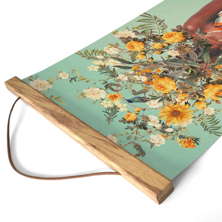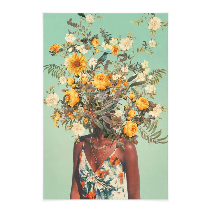 Du liebst stilvoll gestaltete Räume und begeisterst dich für die neuesten Designs und Trends, die das Leben und Wohnen bereichern? Mit diesem Wandbild holst du dir ein echtes Highlight an die Wand! Frank Moth ist ein Künstlerduo aus Veria, Griechenland. Dieses Projekt wurde 2014 gegründet, um der Gegenwart zu entfliehen und eine kreative, nostalgische Welt zu erschaffen. Sie beschäftigen sich mit den Themen Liebe, Demut und Nostalgie und erschaffen surreale Blumenporträts und futuristische Retro-Motive. Diese Fotokunst zeigt eine Frau an einem Sommertag. Ihr Kopf ist mit gelben und weissen Rosen geschmückt. Hol dir die digitale Collage als Roll-up-Banner für dein Zuhause!