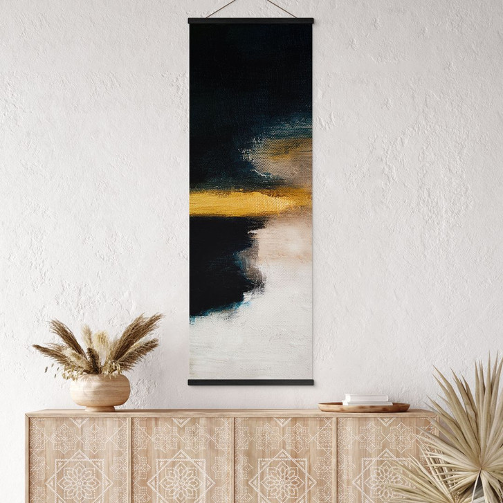 Hol dir das farbenfrohe Stoffbild nach Hause und sorge für einen schönen Farbtupfer an deiner Wand! Ejaaz Haniff ist ein kanadischer Künstler, der seit seiner Kindheit von Farben und Formen fasziniert ist. Für dieses minimalistische Motiv verwendete er kräftige Acrylfarben in Gold, Beige und Schwarz. Dieses farbenfrohe Gemälde kann überall als Statement verwendet werden.