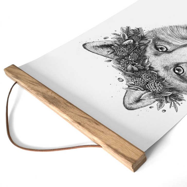 Mit ihrem schwarz-weissen Motiv „Fuchs mit Blumenkranz“ hat die Künstlerin Valeriya Korenkova ein Kunstwerk geschaffen, das durch seine zarte Eleganz und sein detailliertes Design besticht. Der liebevolle Blick des Fuchses, kombiniert mit den zart illustrierten Blumen und Blättern, fängt die Essenz von Natürlichkeit und Ruhe ein. Die monochrome Farbgebung unterstreicht die zeitlose Ästhetik und fügt sich harmonisch in jedes Wohnambiente ein.