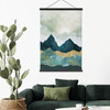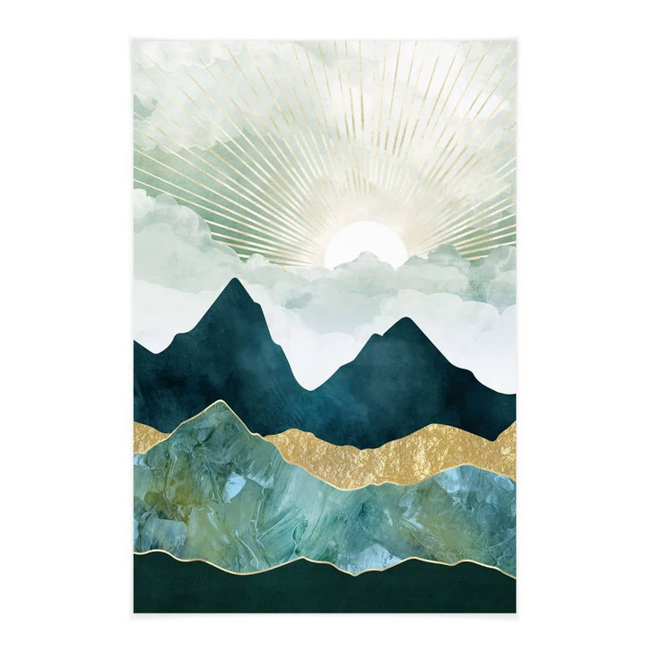 Dieses kunstvolle Stoffbild von SpaceFrog Designs bringt die erhabene Schönheit einer sonnigen Berglandschaft in deine Wohnräume. Die harmonische Kombination aus tiefen Blau- und Grüntönen, akzentuiert durch goldene Details, verleiht dem Bild eine faszinierende Tiefe und Eleganz. Die Sonnenstrahlen, die sanft durch die Wolken brechen, tauchen die majestätischen Berggipfel in ein beruhigendes, warmes Licht und schaffen eine entspannte Atmosphäre.