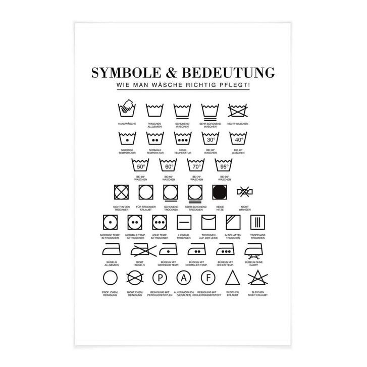 Lust auf eine neue Wandgestaltung? Buchstaben, Wörter und Schrift werden oft als Wanddekoration verwendet. Zum Glück, denn Schrift kann so schön sein und eignet sich ideal als visuelles Gestaltungselement. Dieses Stoffbild hilft dir auch im Haushalt. Bist du dir bei den Waschsymbolen auf deiner Kleidung jedes Mal unsicher? Dann ist dieses Wandbild genau das Richtige für dich! Hier sind alle Symbole für Pflege, Waschen und Bügeln abgebildet. So kann nichts mehr schiefgehen!