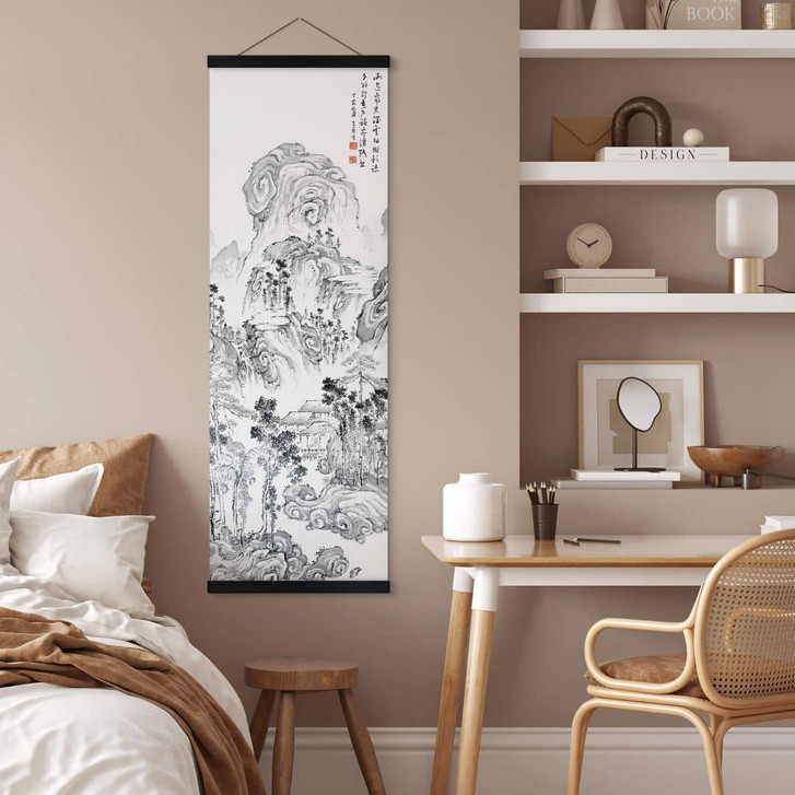 Hier kommt die Lösung für langweilige Wände! Hol dir das Textilbild nach Hause und kreiere einen einzigartigen Look! Das Bild der Serie Black & White and Landscapes schafft mit seinem entspannten Motiv im Panoramaformat eine angenehme und beruhigende Atmosphäre. Das Bild wurde um 1767 von dem japanischen Kalligraphen und Maler Kan Tenju gemalt. Es zeigt eine Landschaft in einem japanischen Dorf in Schwarz-Weiss. Mit diesem asiatischen Kunstwerk kannst du deine Wand stilvoll in Szene setzen.