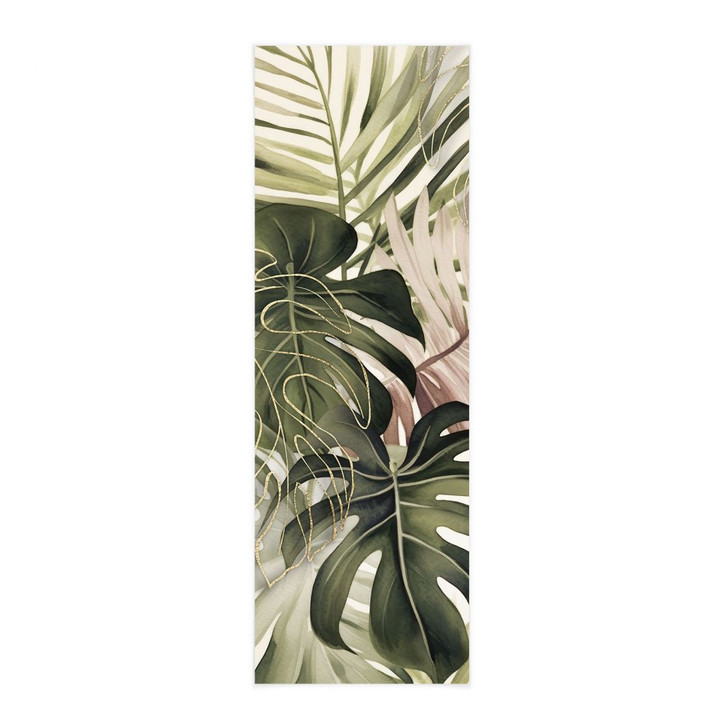 Dieses beeindruckende Textilbild im Panoramaformat bringt die üppige Vielfalt tropischer Blätter auf besonders elegante und moderne Weise in dein Zuhause. Die detailgetreue Wiedergabe von Monstera- und Palmblättern, durchsetzt mit feinen goldenen Akzenten, schafft eine harmonische Komposition, die jedem Raum ein Gefühl von Ruhe und Luxus verleiht. Die längliche Form des Stoffbildes eignet sich ideal, um lange Wände stilvoll zu dekorieren und gleichzeitig ein Gefühl von Weite und Offenheit zu erzeugen.