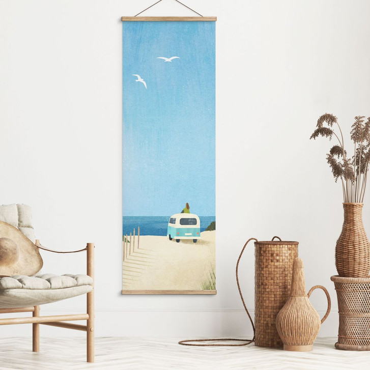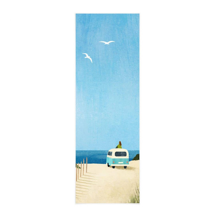 Lass dich von diesem Urlaubsmotiv an den romantischen Strand entführen. Die Illustration stammt von Henry Rivers und zeigt eine Frau, die von ihrem Van aus den Blick auf das weite Meer geniesst. Der Himmel ist strahlend blau, während Möwen über das Meer fliegen. Ein perfektes Bild, um sich zu entspannen und von der nächsten Reise zu träumen. Mit der Bildrolle kannst du dein Badezimmer, Wohnzimmer und Schlafzimmer verschönern und eine kleine Auszeit vom Alltag nehmen.