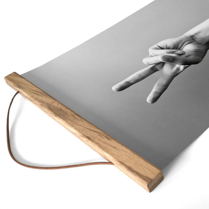Das minimalistische Motiv wird durch eine optionale Posterleiste aus Naturholz stilvoll eingerahmt. Die Kombination aus modernem Schwarz-Weiss-Druck und warmem Holz verleiht dem Kunstwerk eine einladende und harmonische Optik.