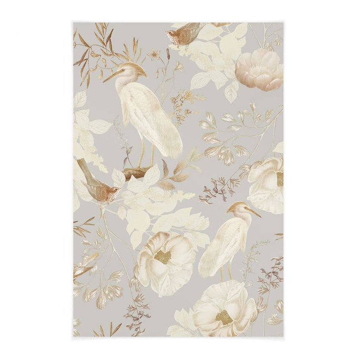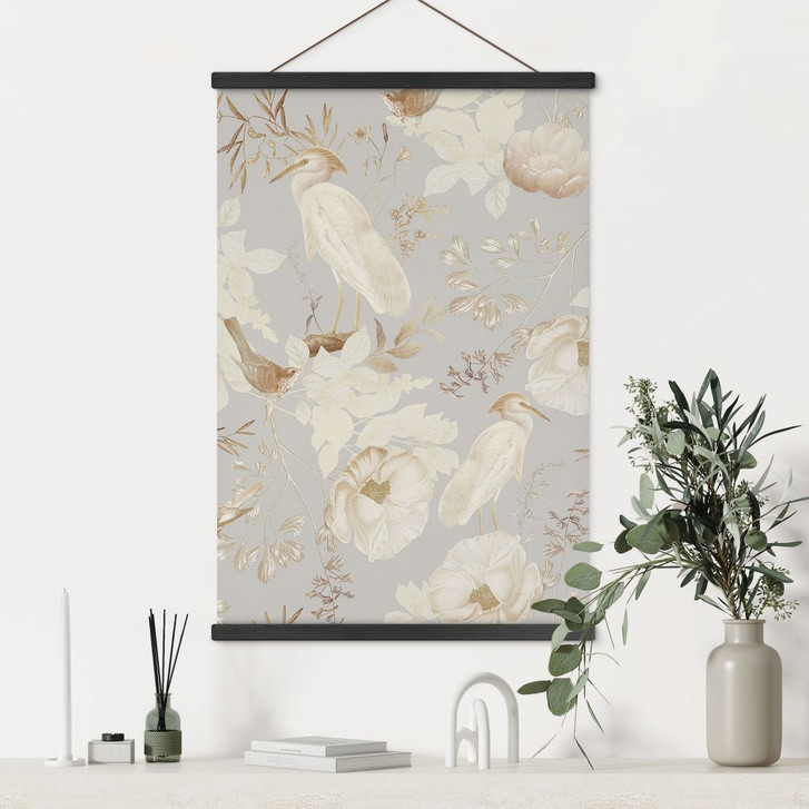 Das Stoffbild von UN Designs verbindet die natürliche Eleganz zarter Vögel und Blumen mit der weichen Haptik eines hochwertigen Textildrucks. Die sanften Beige-, Creme- und Brauntöne auf dem dezenten grauen Hintergrund fügen sich harmonisch in jedes Wohnambiente ein und bringen eine ruhige, angenehme Atmosphäre in Ihre Räume. Mit der optionalen Posterleiste wird dieser Stoff zu einer flexiblen und stilvollen Wanddekoration, die jedem Raum eine besondere Note verleiht.