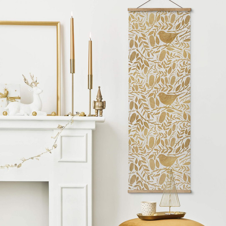 Das Wohnzimmer ist das Herzstück der Wohnung. Mit diesem Wandbild kannst du es spannend gestalten und einen Ort schaffen, der gemütlicher ist. Wer nach originellen Deko-Ideen für die Advents- und Weihnachtszeit sucht, ist mit dem goldenen Bannermotiv „Sparrows and Branches in Gold“ gut beraten. Das abstrakte Winterbild verleiht dem Raum zudem eine warme Ausstrahlung und sorgt für eine besinnliche Stimmung. Mach es dir mit unseren weihnachtlichen Motiven in deinem Zuhause gemütlich – das Textilbild lässt sich gut mit anderen Wintermotiven kombinieren. Dieses Stoffbanner in goldenen und weissen Farben gestaltet die Wand in einem puristischen Stil und sieht aufgehängt elegant aus. Mit der Holzstange, die du ebenfalls bei uns bestellen kannst, entsteht ein angenehmes Gesamtbild. Das Motivbanner besteht aus feinem Polyestergewebe, das blickdicht und wasserabweisend ist.